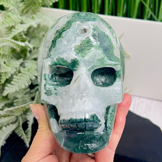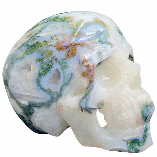 Large Moss Agate Druzy Skull Healing Crystal Carving 1218g