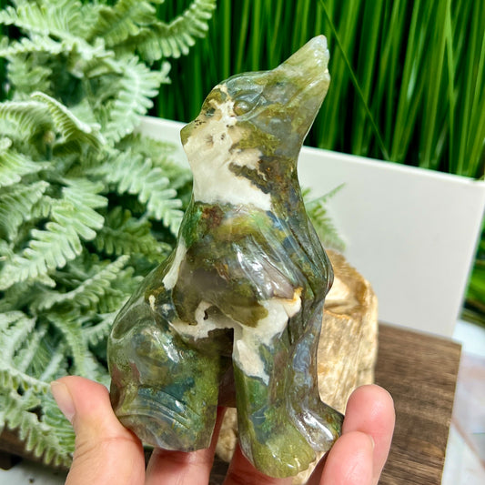 Moss Agate with Quartz Howling Wolf Healing Crystal Animal Carving 326g
