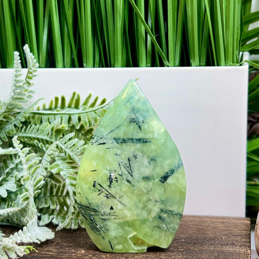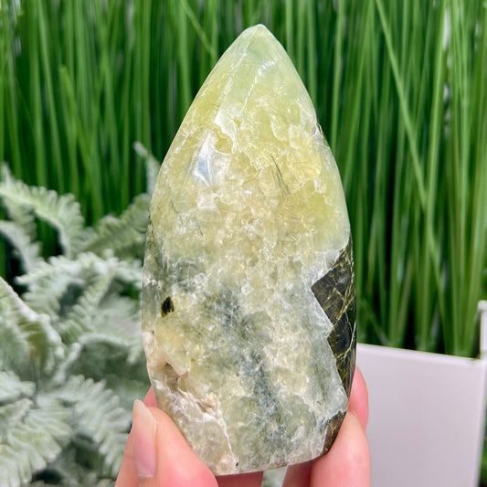 Prehnite with Epidote Flame Free Form Crystal Carving 204g