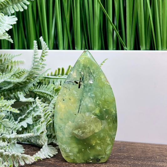 Prehnite with Epidote Flame Free Form Crystal Carving 210g