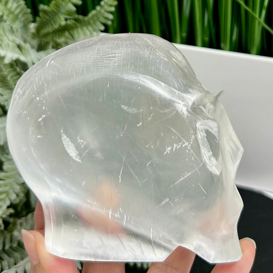 Satin Spar Selenite Alien Skull Top Quality Translucent Crystal Morocco 980g