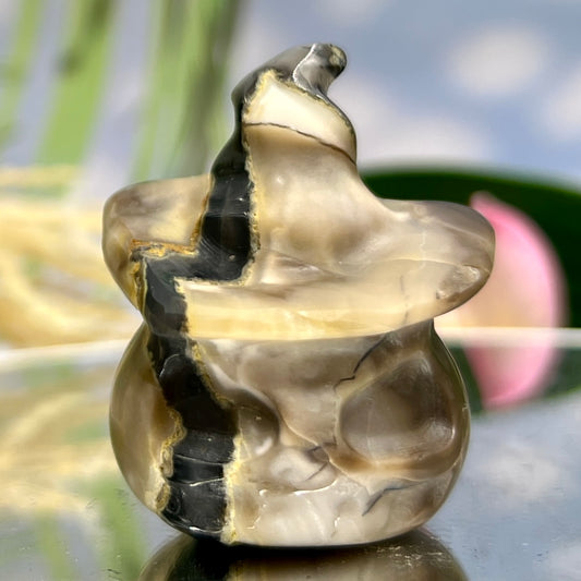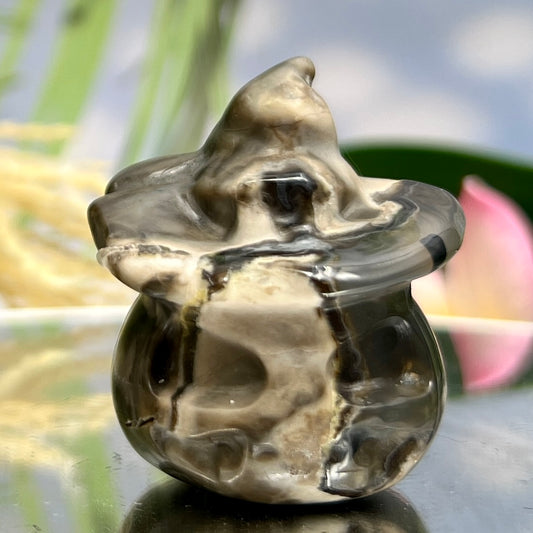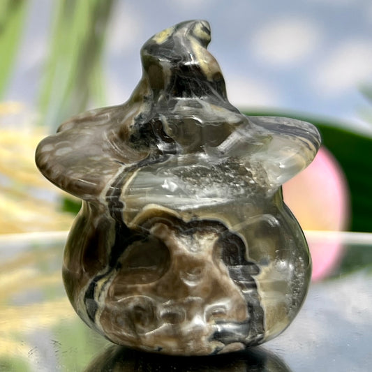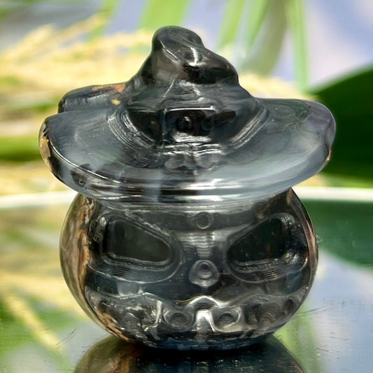 Volcanic Agate Halloween Pumpkin with Witches Hat UV Reactive Crystal 72g