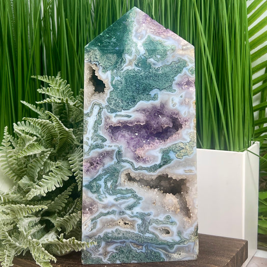 Moss Agate with Amethyst Unique Tower Crystal Generator 4544g 10lbs