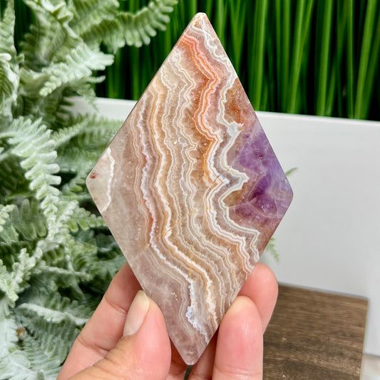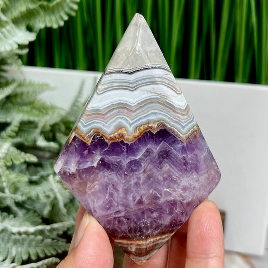 Amethyst with Mexican Lace Agate Rhombus with Stand Healing Crystal Carving