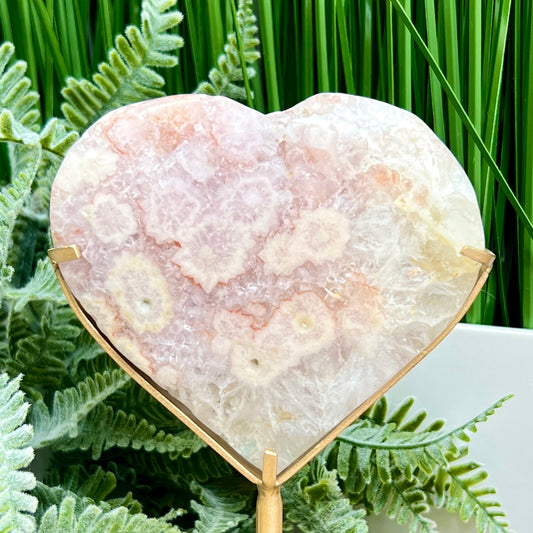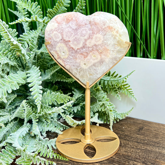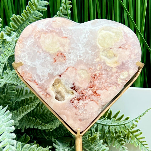Pink Amethyst Flower Agate Quartz Heart with Stand Healing Crystal Carving 340g