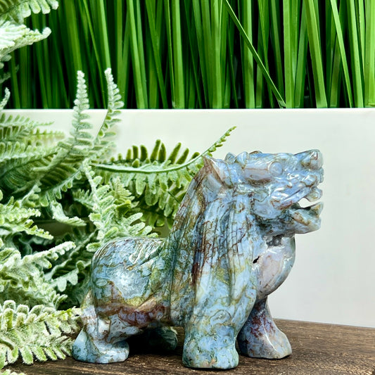 Ocean Sea Jasper Moss Agate Qilin Mythical Lion Healing Animal Crystal 304g