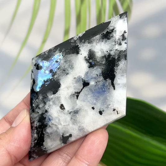 Rainbow Moonstone with Black Tourmaline Rhombus Display with Stand Healing Crystal Carving