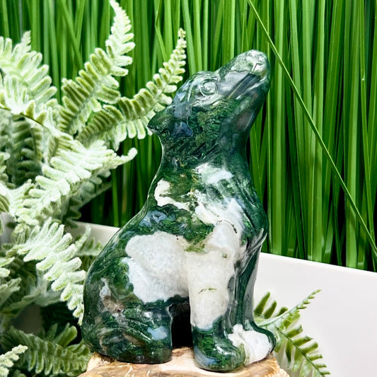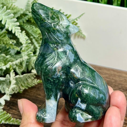 Moss Agate with Quartz Howling Wolf Healing Crystal Animal Carving 253g