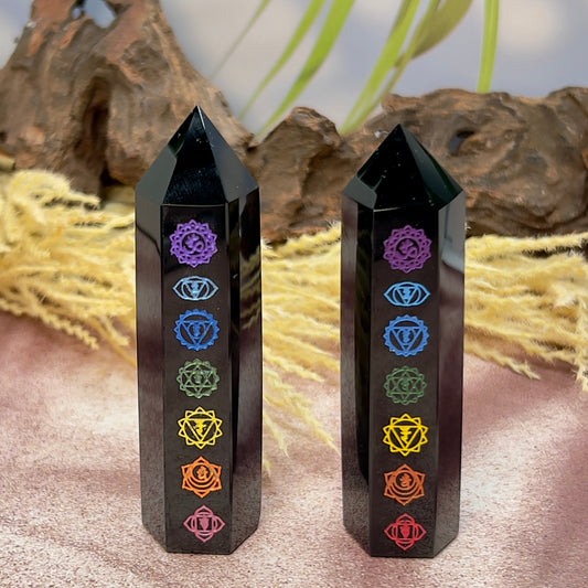 Black Obsidian Points With Chakra Print Crystal Generators YOU CHOOSE