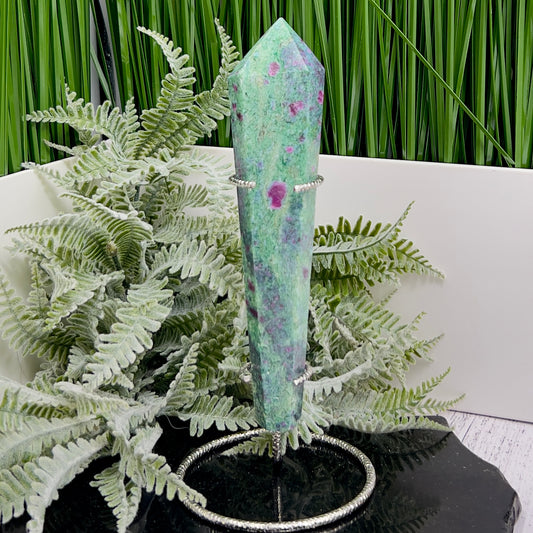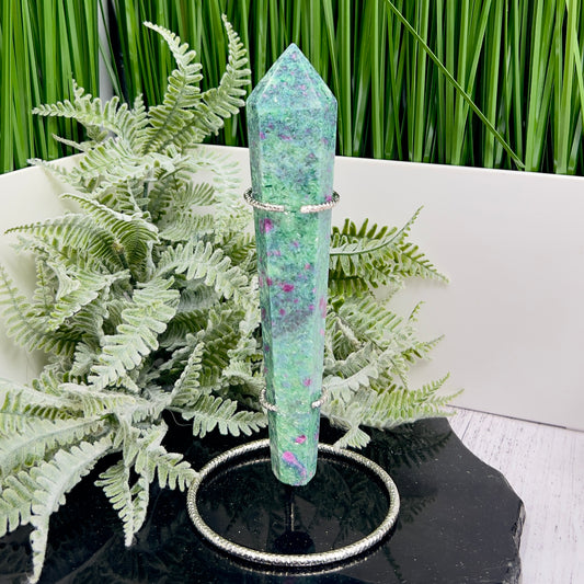 Ruby in Fuchsite UV Reactive Crystal Wand in Stand Generator 264g 165mm