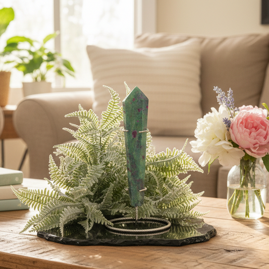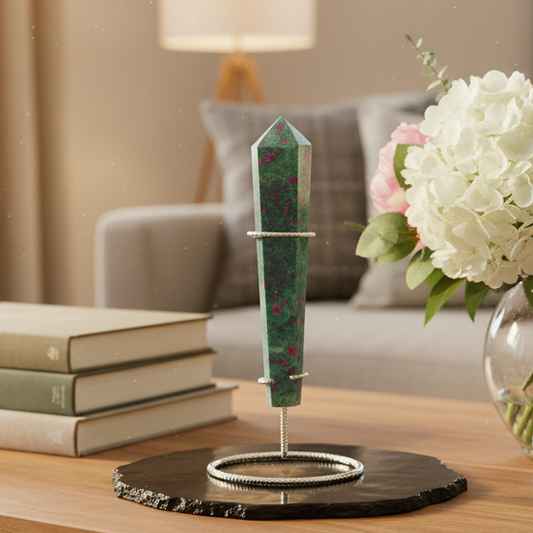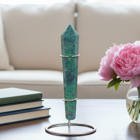 Ruby in Fuchsite UV Reactive Crystal Wand in Stand Generator 282g 170mm