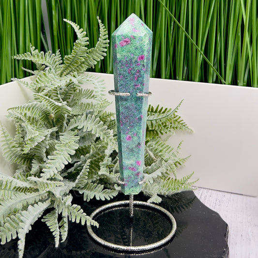 Ruby in Fuchsite UV Reactive Crystal Wand in Stand Generator 246g 171mm