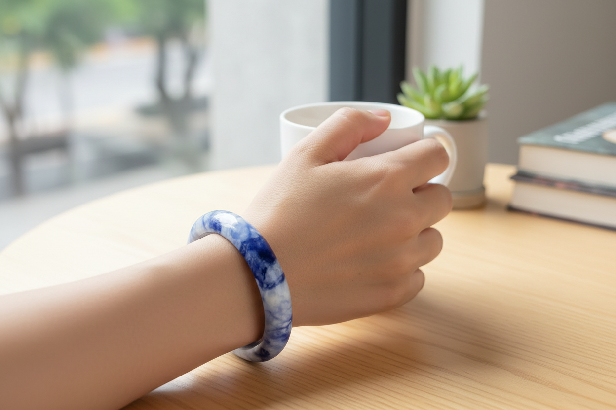Please note: Please do not force the bangle over your hand. If it does not easily fit over your hand, forcing it may break the bangle.