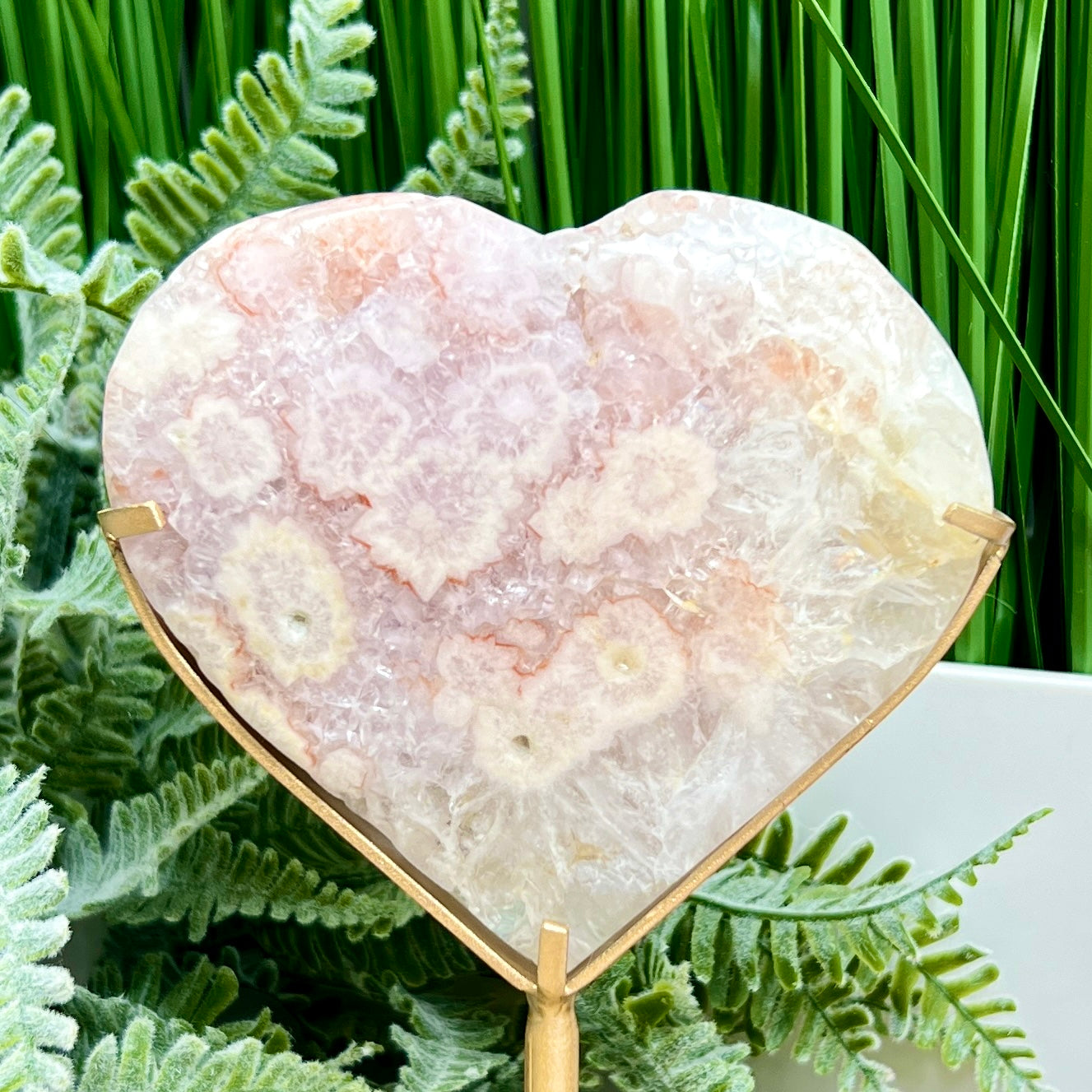 Pink Amethyst Flower Agate Quartz Heart with Stand Healing Crystal Carving 314g