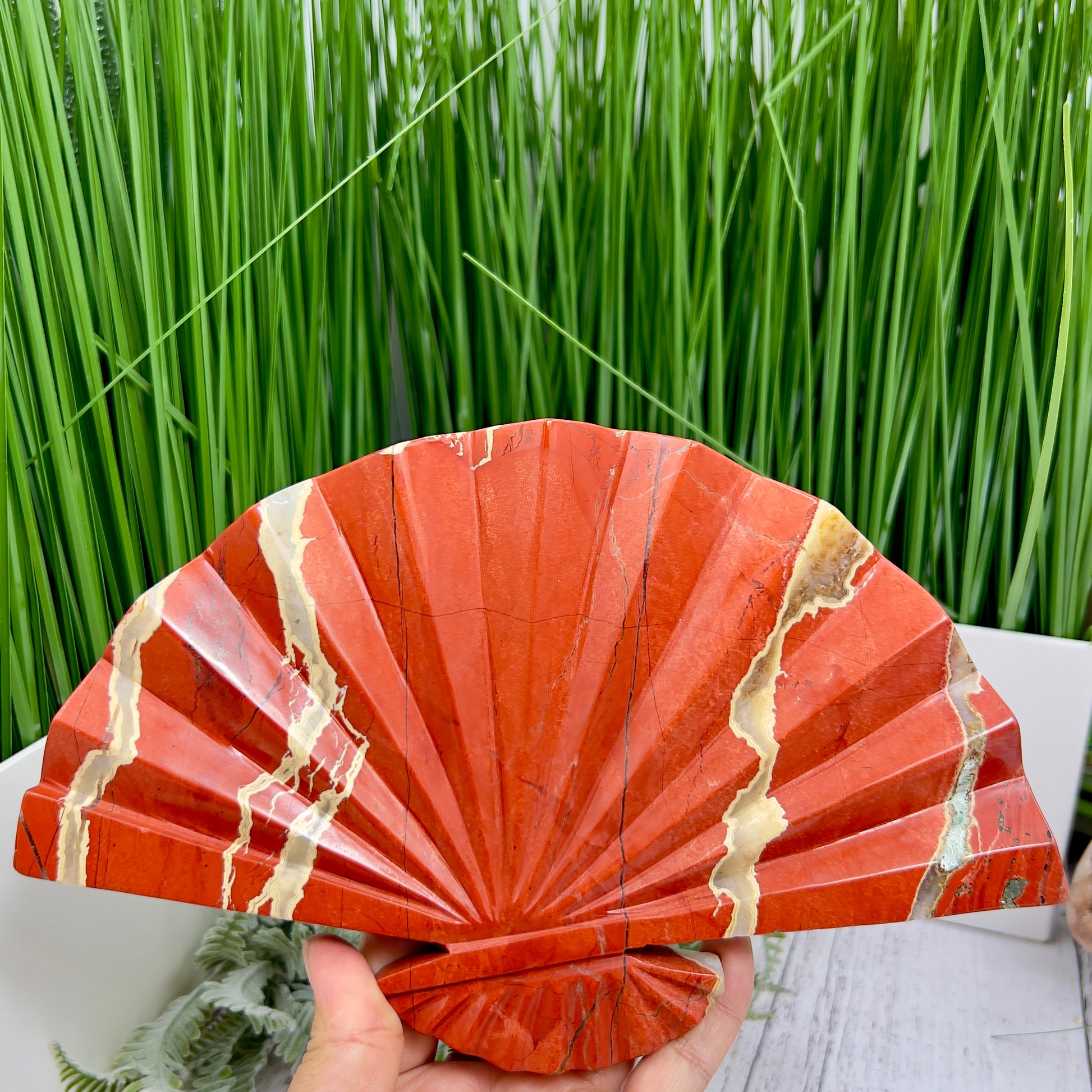 Red Jasper Gemstone Fan with Stand Crystal Carving 641g